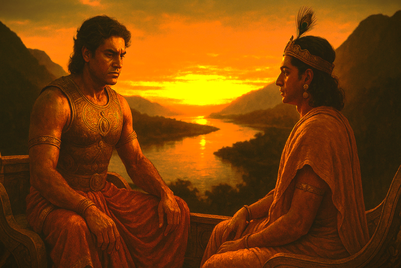 On the eve of war, Karna laments a life of rejection and unlucky turns. Krishna answers with a simple image a river meeting mountains on its way to the sea. The point isn’t the obstacle; it’s the flow. Your birth is not your identity; your actions, loyalty, and courage are.